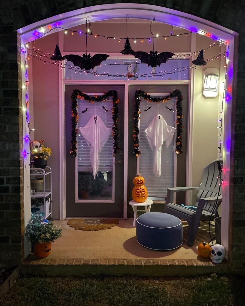 This stunning Halloween apartment decor transforms an ordinary covered porch into a supernatural sanctuary. Purple LED string lights create an otherworldly glow while cascading bats dance overhead. The genius lies in layering ghostly white fabric against dark garlands, making small spaces feel dramatic.