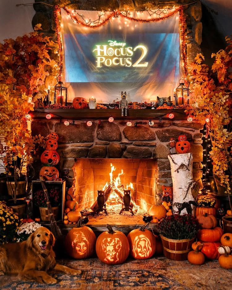 This spectacular Halloween apartment decor transforms a fireplace area into an entertainment center with carved pumpkin faces and autumn garland. The Hocus Pocus movie display creates a themed viewing experience while string lights add magical ambiance. Fall foliage brings natural textures that complement the carved pumpkins.