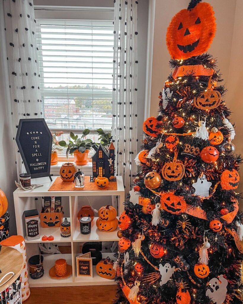 Transform your living room with this show-stopping halloween apartment decor centerpiece. A black Christmas tree becomes the ultimate spooky statement piece when adorned with orange pumpkin ornaments, ghostly white figures, and twinkling lights. The nearby shelving unit displays an impressive collection of jack-o’-lanterns, miniature haunted houses, and seasonal signs.