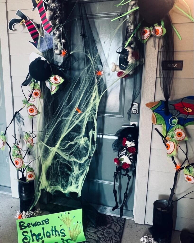 Create an unforgettable first impression with this elaborate halloween apartment decor entrance design. Thick artificial spider webs stretch across the doorframe while hanging skeleton decorations and glowing eyeball garlands frame the space menacingly. The “Beware Sheloths” sign adds a playful twist to traditional Halloween warnings.