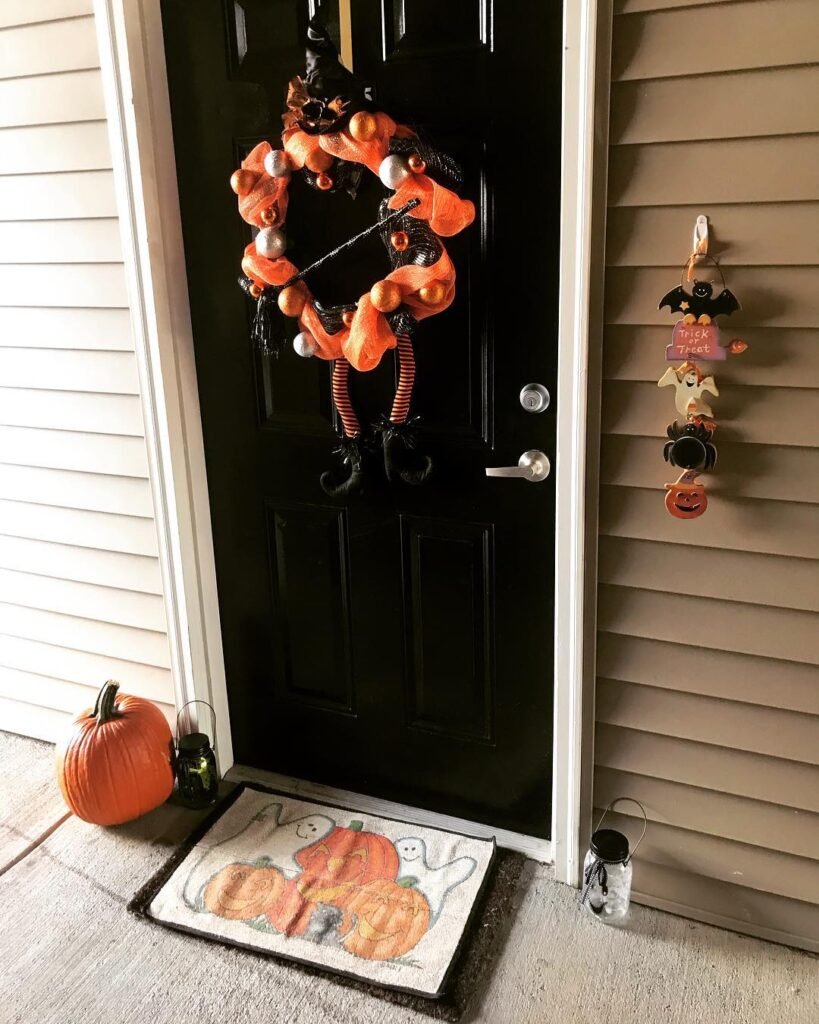 This delightful halloween apartment decor approach balances spooky with sophisticated. The orange and black deco mesh wreath features dangling witch legs, creating movement and whimsy. Paired with a cheerful pumpkin doormat and seasonal lantern, this entrance feels inviting rather than intimidating.