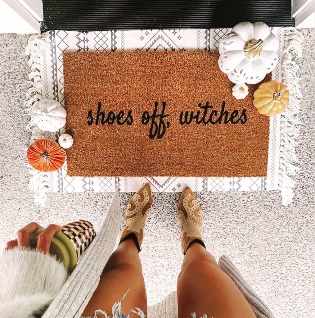 Elevate your halloween apartment decor with this refined autumn entrance display. The “shoes off, witches” doormat strikes the right balance between Halloween spirit and everyday functionality. White and orange pumpkins arranged on a geometric rug create visual interest without overwhelming the space.