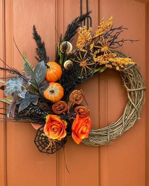 This gorgeous halloween apartment decor wreath showcases autumn’s natural beauty with orange roses, mini pumpkins, and rich foliage against weathered wood siding. The grapevine base provides rustic charm while silk flowers ensure lasting beauty throughout the season.