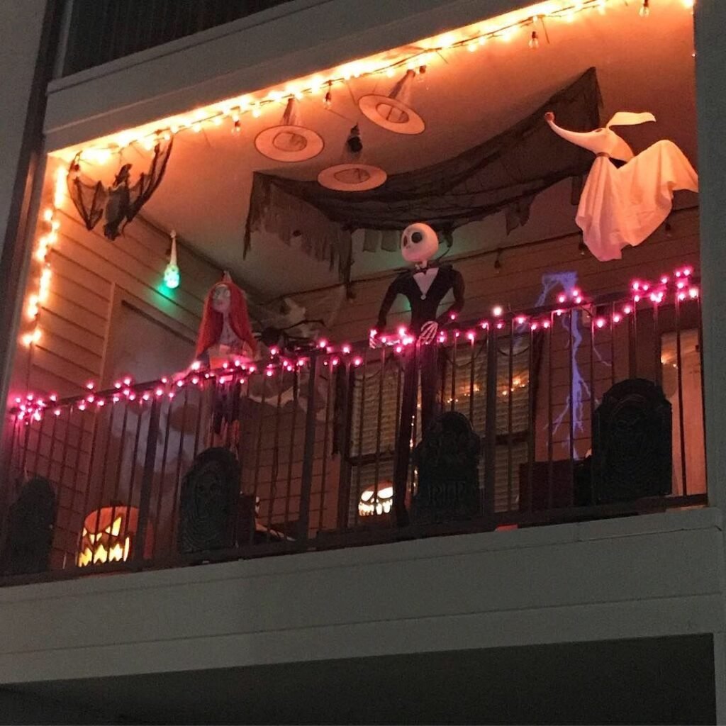 This balcony Halloween apartment decor creates a mini haunted house experience using clever staging techniques. The skeleton figure becomes the star performer, positioned to greet visitors with dramatic flair. Red string lights provide eerie ambiance while maintaining neighborhood-friendly brightness levels.