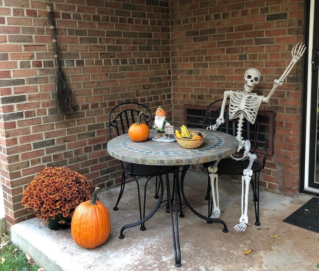 This delightful Halloween apartment decor brings whimsical humor to outdoor dining spaces. The skeleton guest sits ready for conversation, complete with seasonal table settings and autumn mums. The brick backdrop provides natural texture that complements orange pumpkins beautifully.