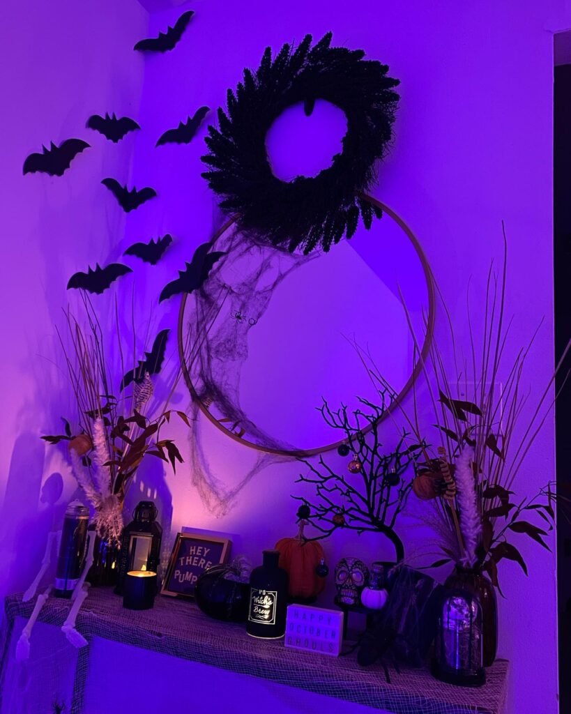 This dramatic Halloween apartment decor transforms an interior corner into a mysterious witch’s den. The deep purple lighting creates an immersive environment while black bats seem to flutter through the air. The circular wreath adds architectural interest without permanent wall changes.