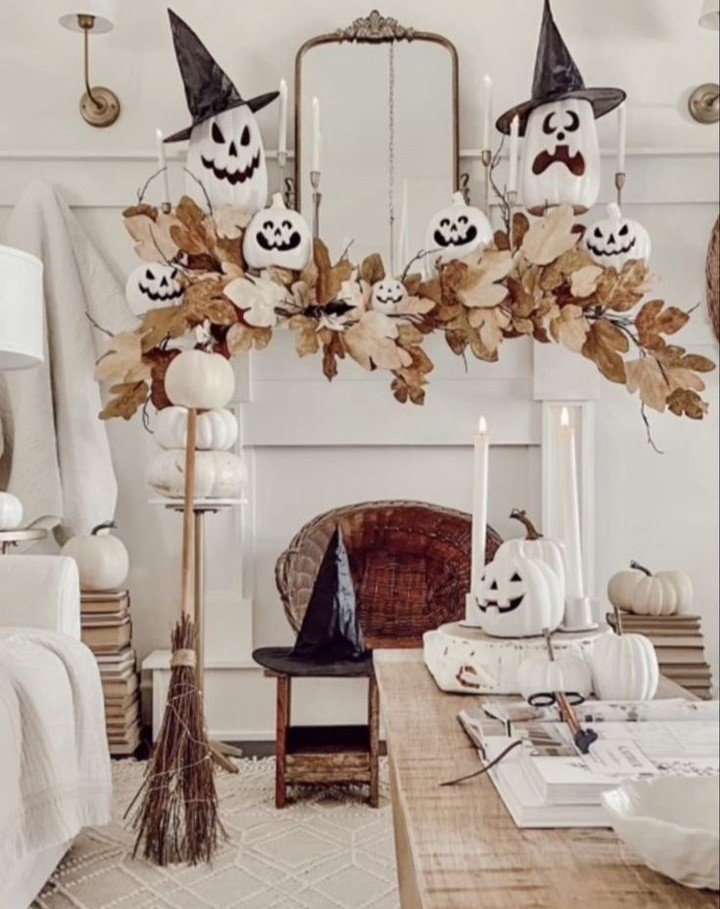 This sophisticated Halloween apartment decor elevates traditional spooky themes through elegant white and neutral tones. The mantel garland combines fall leaves with cheerful ghost faces, creating family-friendly charm. Witch hats add classic Halloween elements without overwhelming the refined aesthetic.