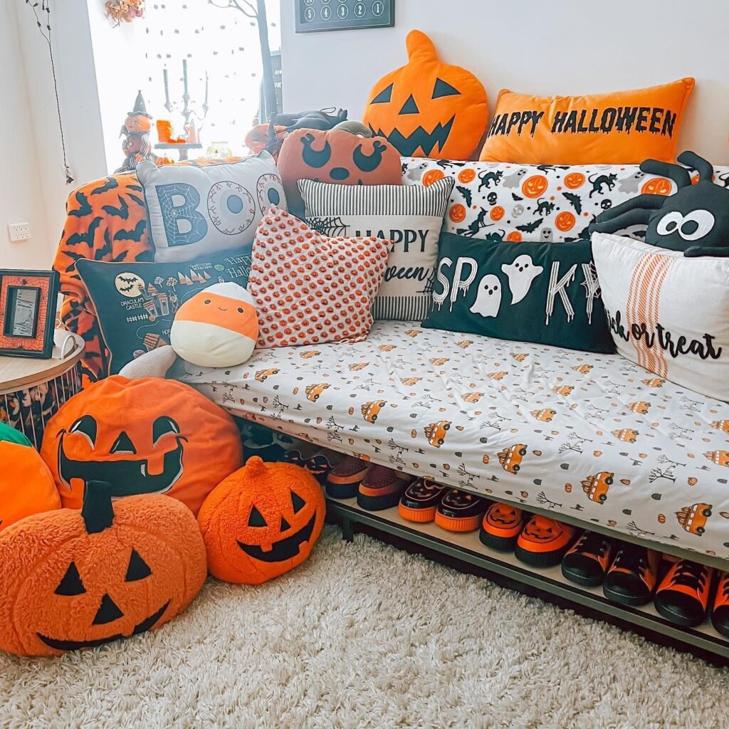 This charming Halloween apartment decor transforms a bedroom into a festive retreat using soft textures and playful patterns. Orange pumpkin pillows create instant seasonal vibes while black and white themed bedding adds sophisticated contrast. The collection of Halloween throw pillows tells a story across the bed.