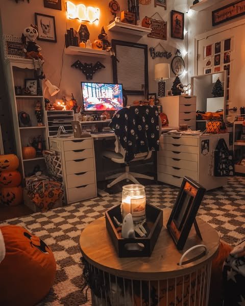 Multiple pumpkins scattered throughout the space maintain the Halloween theme while staying practical for daily use. The checkered floor pattern adds visual interest that complements the orange and black color scheme. This setup demonstrates how halloween apartment decor can enhance existing spaces rather than overwhelm them. The lighting creates perfect ambiance for both work and Halloween movie marathons, proving that seasonal decorating can be both stylish and functional.