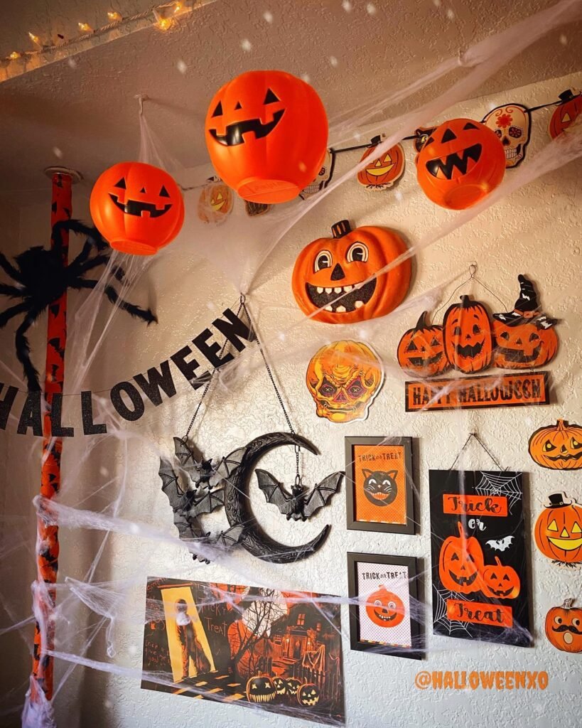 This nostalgic Halloween apartment decor celebrates retro Halloween charm through a carefully curated wall display. Illuminated pumpkin garland provides festive lighting while vintage-inspired decorations create visual depth. The mix of sizes and textures keeps the display interesting from floor to ceiling.