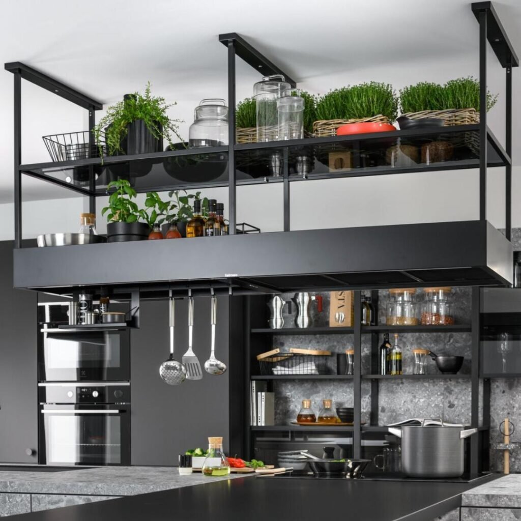 Black metal framework creates a striking contrast against modern kitchen aesthetics. This suspended shelving system combines form and function, displaying glassware and storing cooking essentials in plain sight. The industrial design adds character while maintaining practical accessibility.