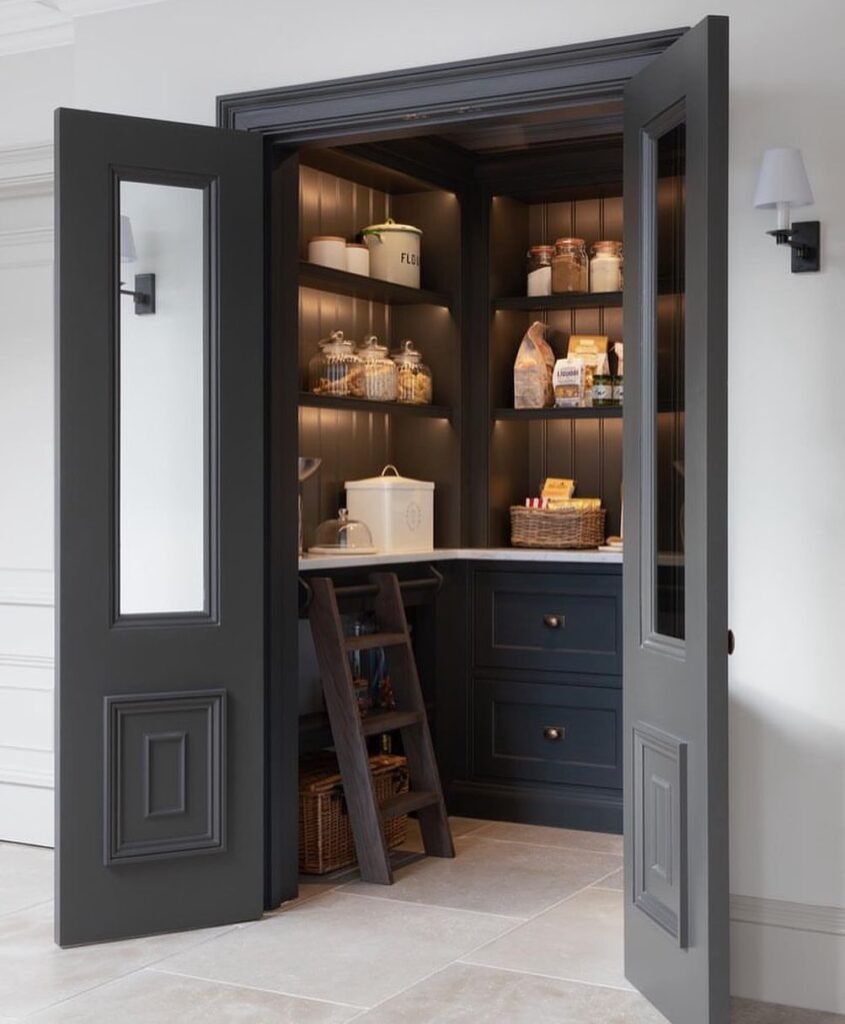Charcoal-painted French doors conceal a complete pantry system that rivals any walk-in storage room. The built-in cabinetry features adjustable shelving, deep drawers, and specialized storage zones for different food categories. Warm lighting illuminates every corner, making inventory management simple.