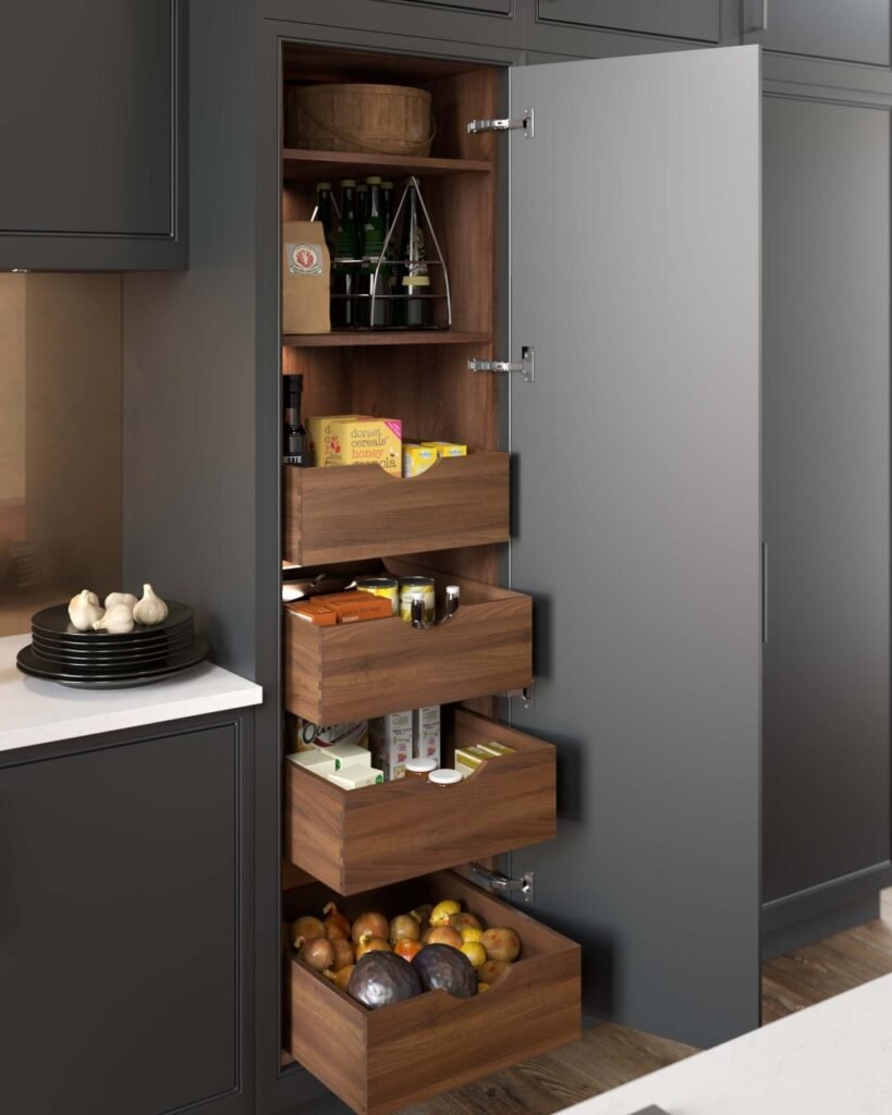 Each drawer serves a specific purpose – from fresh produce at the bottom to packaged goods up top. The warm wood interior creates beautiful contrast against the cool gray exterior. This system works brilliantly in narrow spaces where traditional pantries won’t fit.