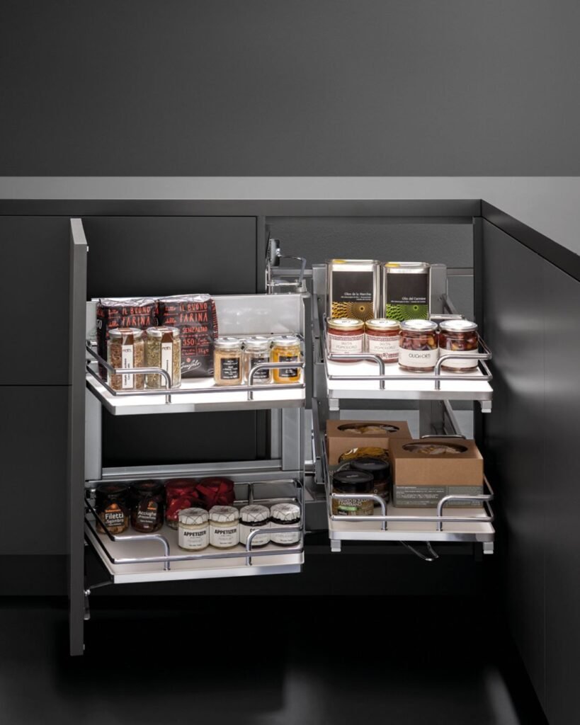 This kitchen storage innovation solves the common corner cabinet problem with style and efficiency. Installation requires professional measurement but transforms wasted space into highly organized storage. The system works particularly well for frequently used cooking essentials and pantry overflow items.