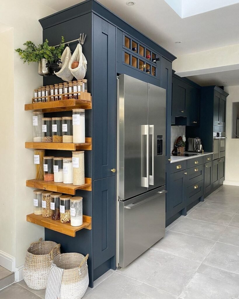 This innovative kitchen storage idea turns an ordinary wall into organized bliss. Floating wooden shelves display clear containers in perfect rows, creating both function and visual appeal. The deep blue cabinetry provides stunning backdrop for the natural wood elements.