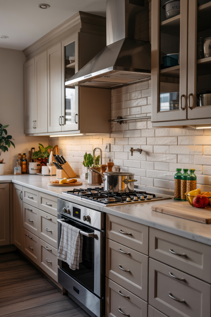 Under-cabinet LED lighting offers practical illumination for kitchen countertops. It reduces shadows while preparing food and improves visibility in work areas.
