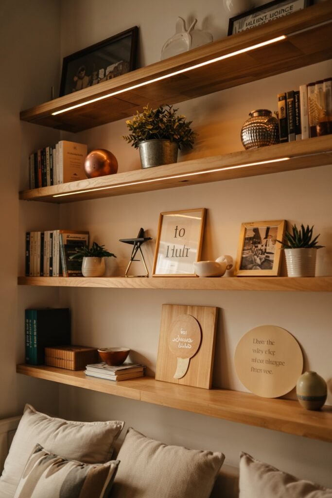 LED strip lights installed under floating shelves offer consistent ambient lighting that enhances the space’s aesthetics. They help highlight objects on the shelves without overpowering the room.