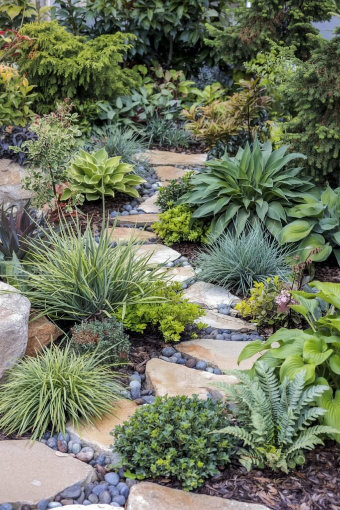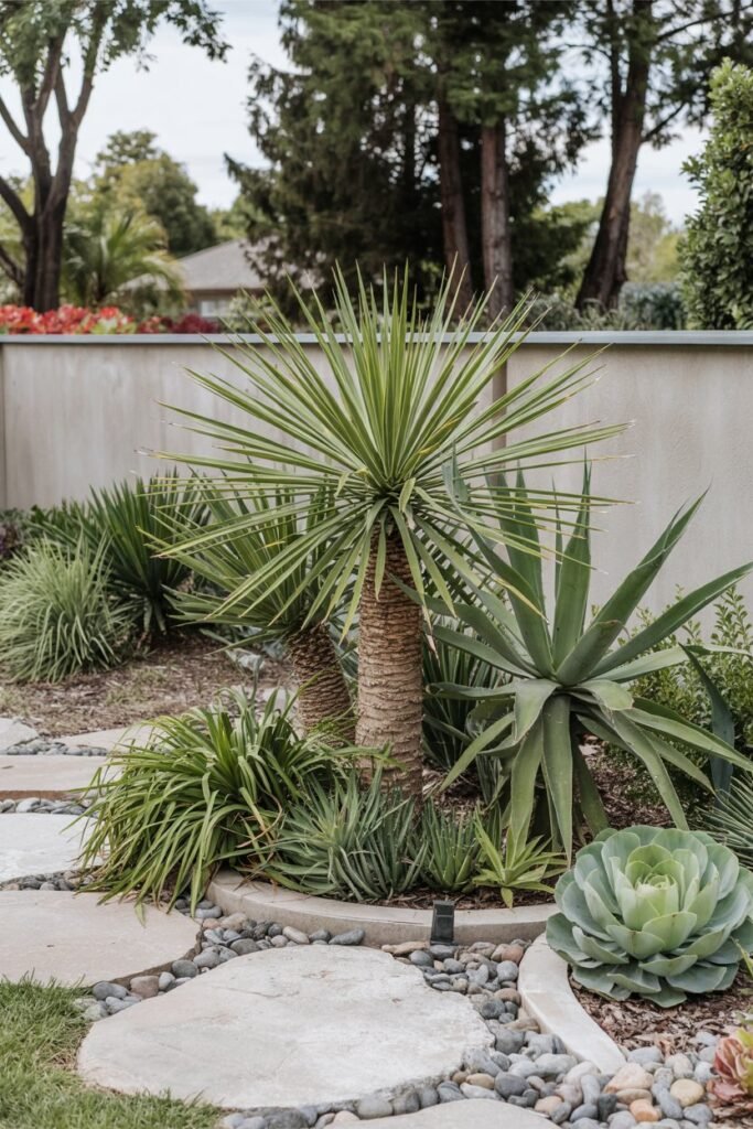 Use structurally interesting plants like yucca, ornamental cabbage, or architectural ferns as natural focal points.