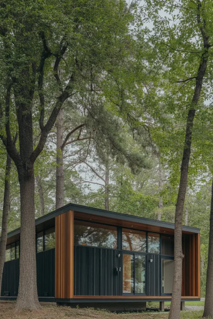 I love how this home uses dark paint colors and natural wood tones to blend into its wooded surroundings. It achieves a modern, sophisticated look without feeling out of place in nature.