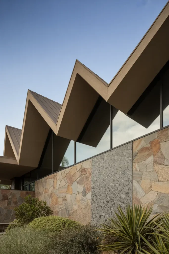 The unique zig-zag roofline makes this home memorable and visually dynamic. Combined with the earthy texture of stone, it creates a striking and unforgettable exterior.