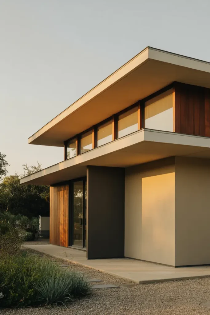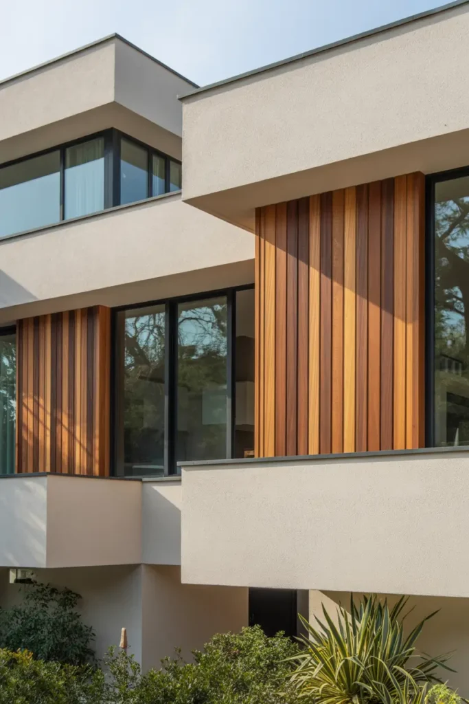 I admire the way this exterior combines the smooth texture of white stucco with the warmth of natural wood siding. It creates a balanced and visually interesting facade that feels both modern and organic.