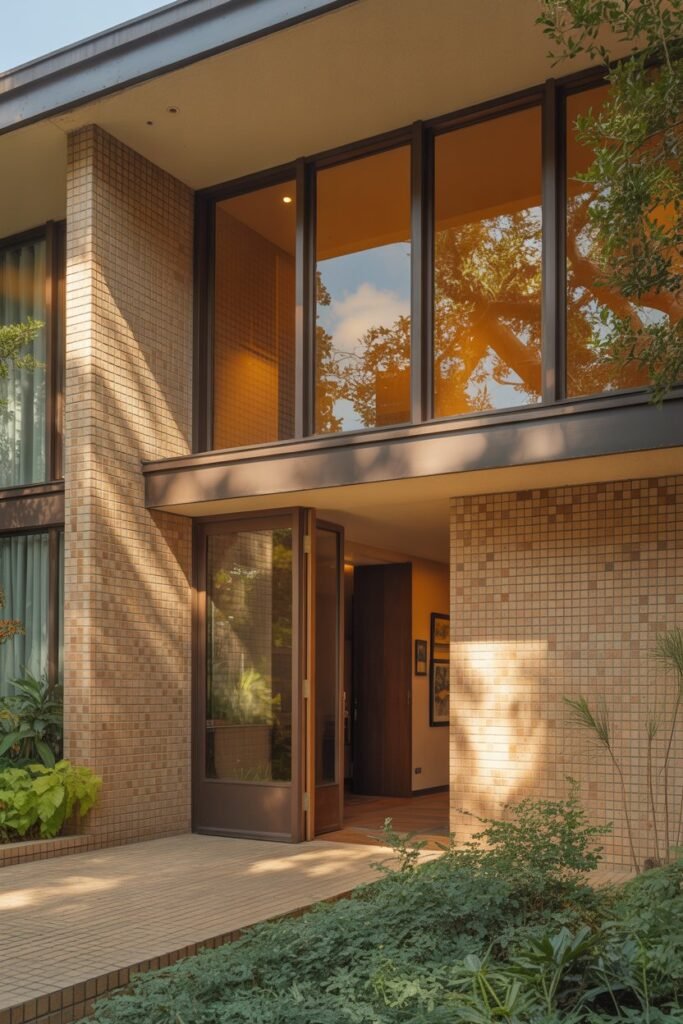 This home features an inviting atrium-style entry that I find so welcoming. The open-air space, combined with Heath tile walls and clerestory windows, creates a warm and modern first impression.