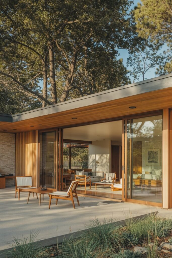 This design is a perfect example of the mid-century emphasis on indoor-outdoor living. I love how the sliding glass doors open directly onto a spacious patio, effectively doubling the living area.