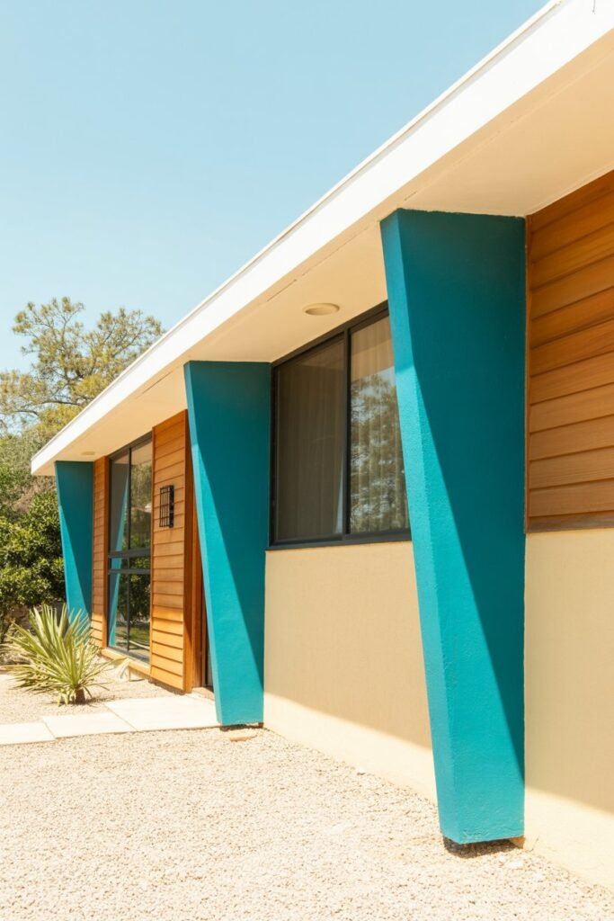 While many mid-century homes stick to earthy tones, I love seeing a bold splash of color. The turquoise accent panels on this exterior add a fun, retro vibe that feels playful and optimistic.