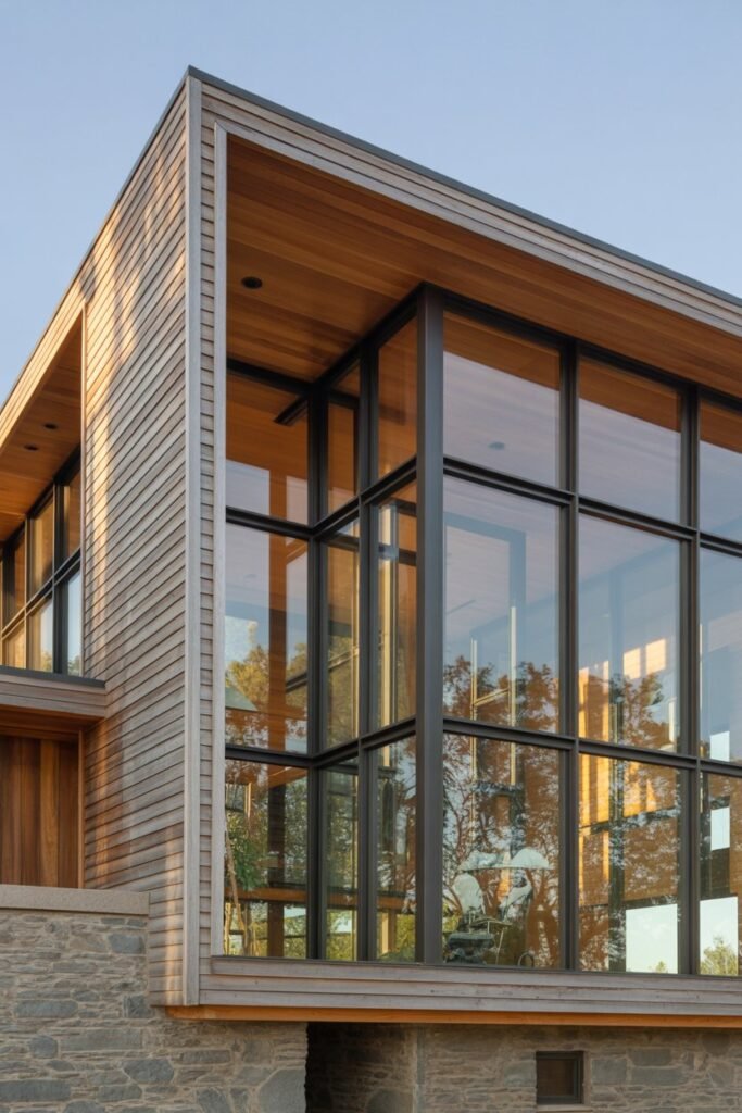 This design is a masterclass in mixing materials, using wood, stone, and steel to create a stunning exterior. I’m particularly struck by the extensive use of large windows, which not only looks artistic but also floods the home with natural light.