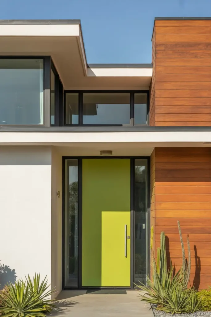 I love the idea of using the front door to add a vibrant pop of color. A bright lime green or a warm orange door can bring a sense of fun and personality to the home’s exterior.