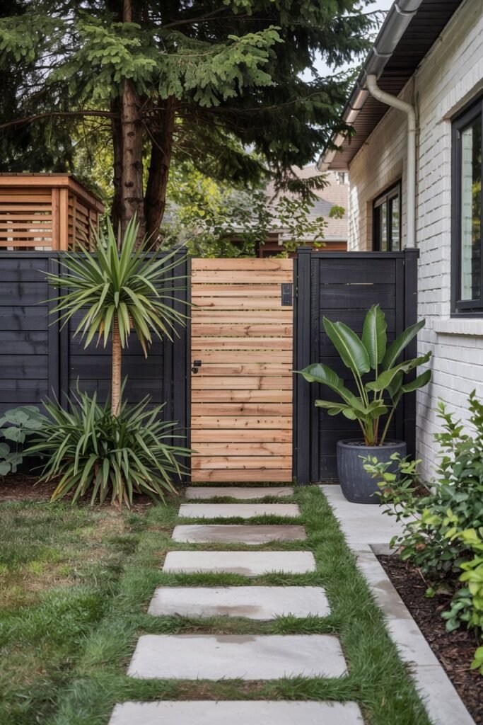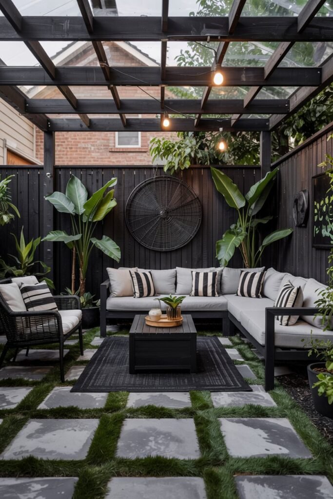 I’m not afraid to use black liberally for a super modern, moody atmosphere. Dark fencing, black furniture, or charcoal-toned pavers create dramatic contrast, especially against greenery.