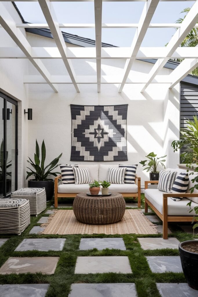 I combine geometric patterns through different elements—square pavers underfoot, angular furniture shapes, and patterned textiles on cushions and ottomans. The key is maintaining a consistent color palette while varying the scale and type of patterns.