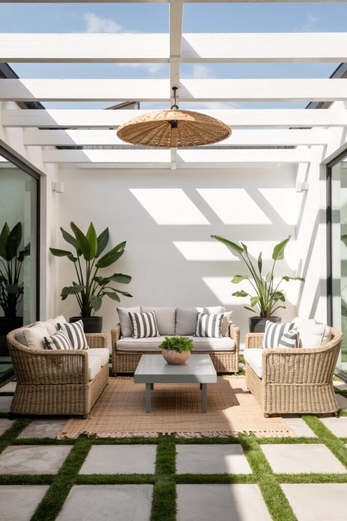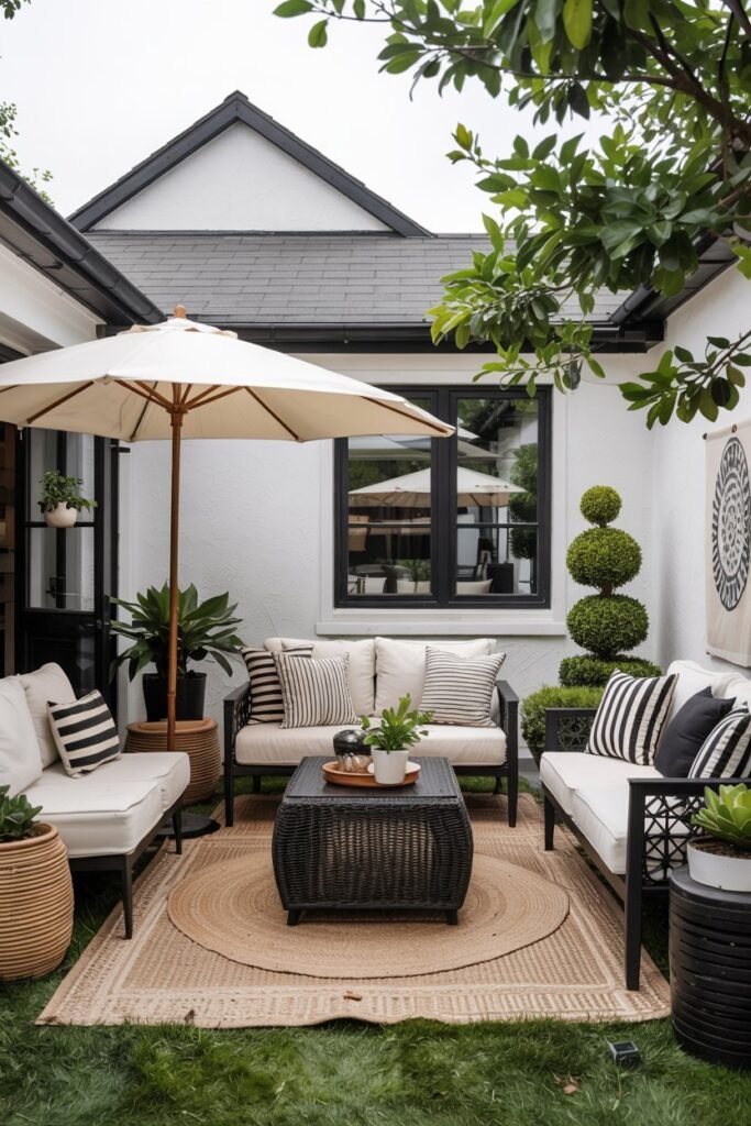 I start with primarily white furnishings—cushions, umbrellas, and accessories—then add pops of black through furniture frames, planters, or accent pieces. This high-contrast approach provides drama and sophistication while serving as a neutral backdrop that allows greenery and architectural features to shine.