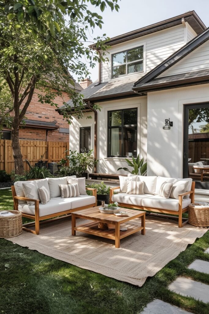I furnish a section of my backyard exactly as I would an indoor living room—with a full sofa, coffee table, side tables, and proper lighting. I choose warm wood furnishings upholstered in weather-resistant white fabric for a clean, modern look.