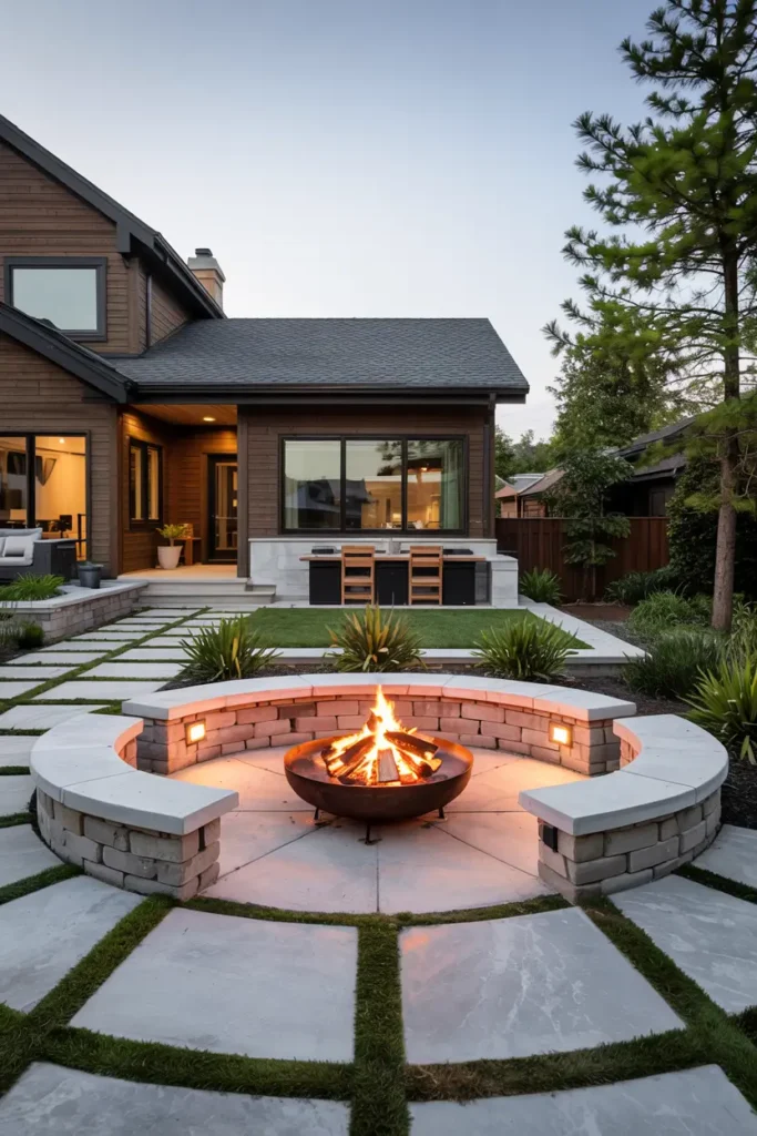 A circular fire pit area surrounded by modern seating creates a natural gathering space with architectural presence. I design the pit to complement the home’s existing architecture rather than clash with it.