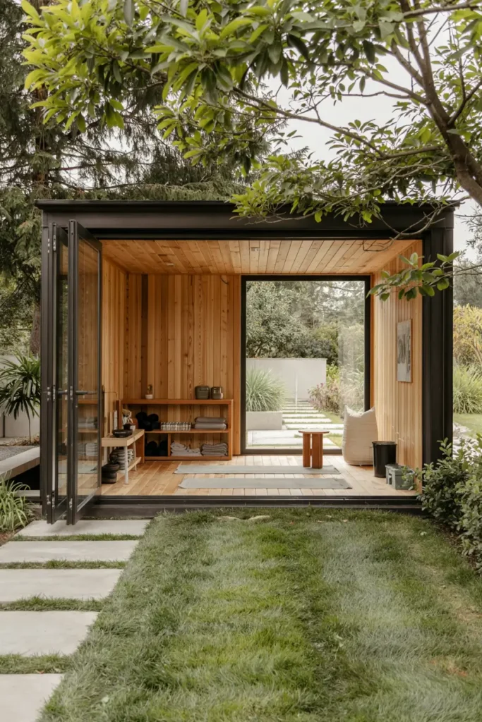 I’ve created a dedicated wellness space with indoor-outdoor appeal using bifold glass-and-steel doors. This modern studio feels like an extension of the manicured lawn rather than a separate structure.