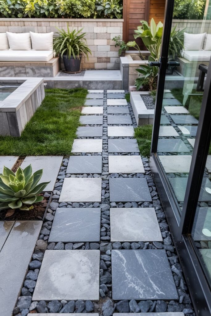 Large square pavers have become my go-to choice for modern patio designs. I space them out slightly and fill the gaps with contrasting gravel or sand to create a geometric pattern that feels both intentional and sophisticated.