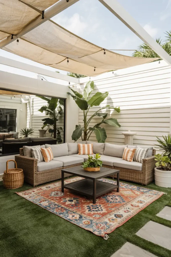 I layer a colorful patterned area rug over artificial turf or concrete to instantly define a seating area. The rug anchors a large sectional sofa and creates a cohesive living space within the larger backyard.