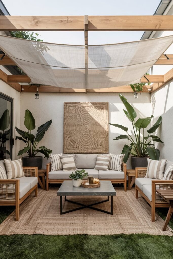 I anchor the seating area with an outdoor rug that defines the space and adds warmth underfoot. A shade structure overhead—whether a pergola, umbrella, or sail shade—makes the area truly functional for extended use. This combination creates an outdoor living room that rivals indoor comfort.