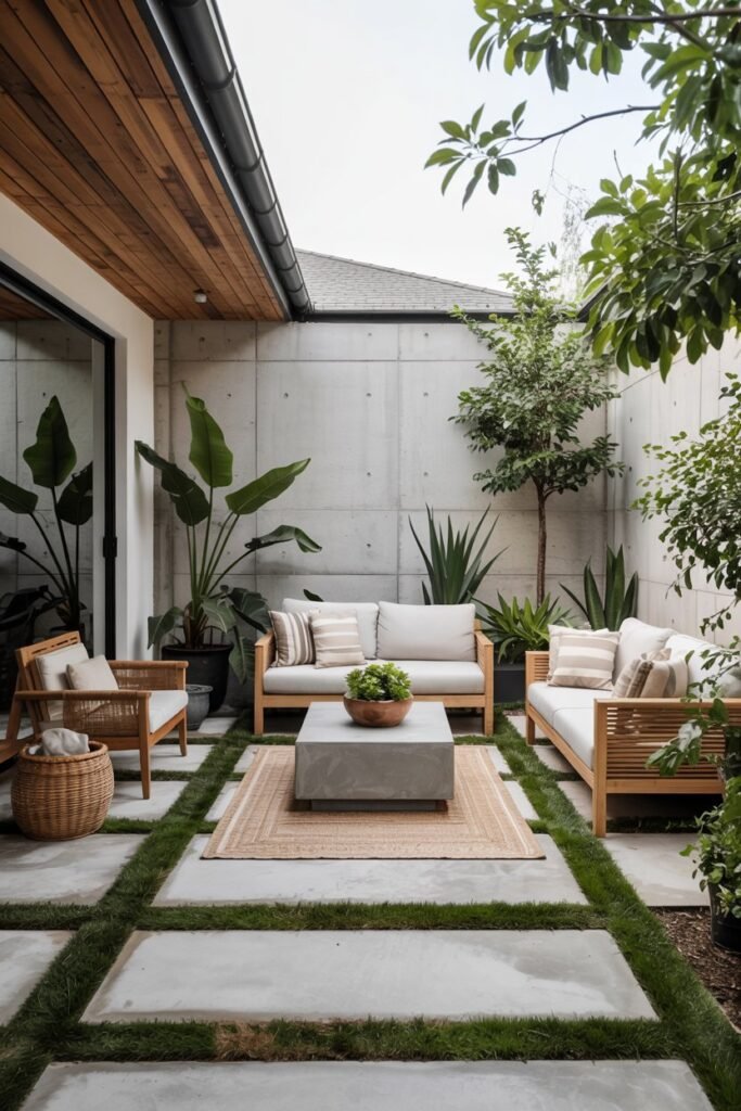 Large concrete slabs with smooth finishes offer the ultimate modern foundation. I choose this over smaller pavers or intricate patterns because it creates a clean, uninterrupted surface.