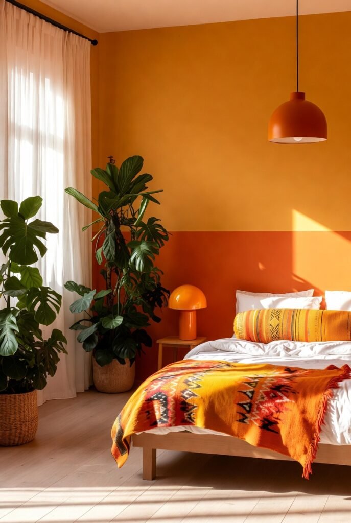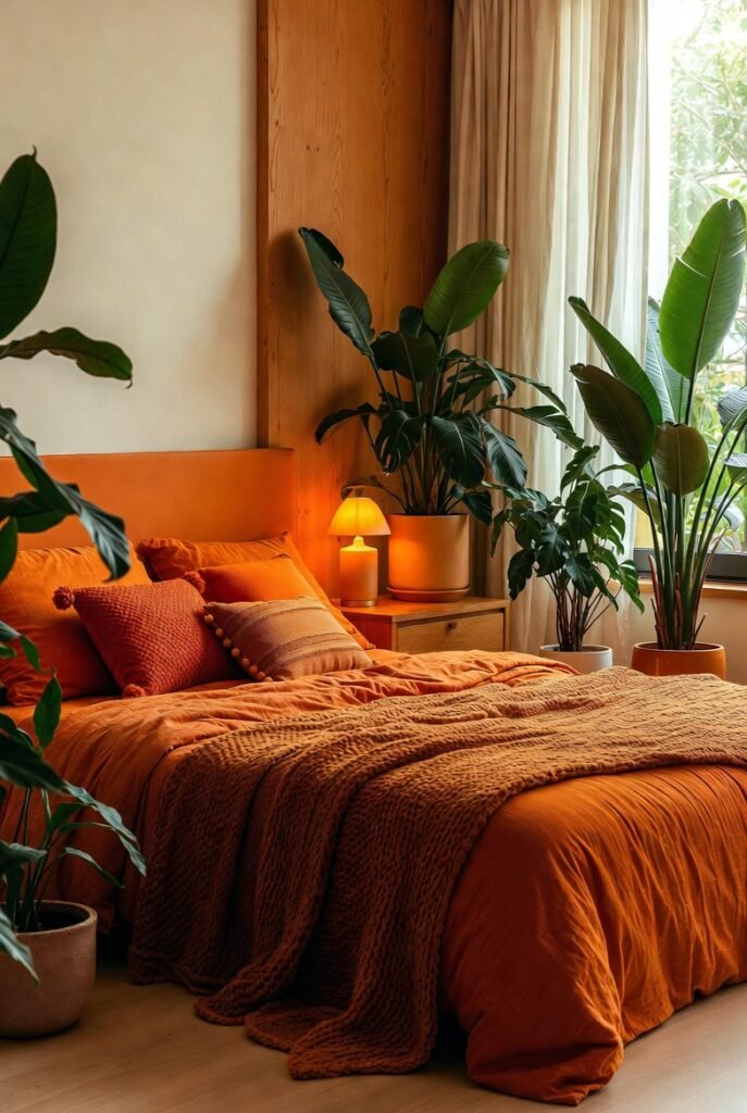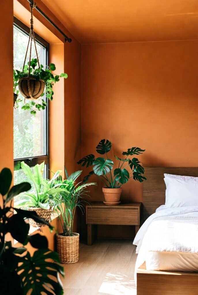 I believe every room needs a houseplant, and an orange bedroom is no exception. The lush green leaves create a beautiful contrast with the vibrant orange, giving the space a lively, tropical feel.