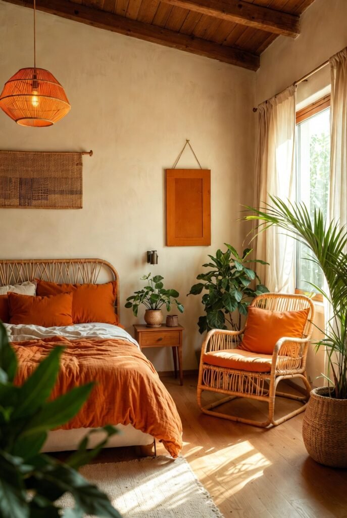 I use a rattan headboard, chair, or light fixture with orange bedding and plenty of houseplants to create a relaxed, boho-chic sanctuary.