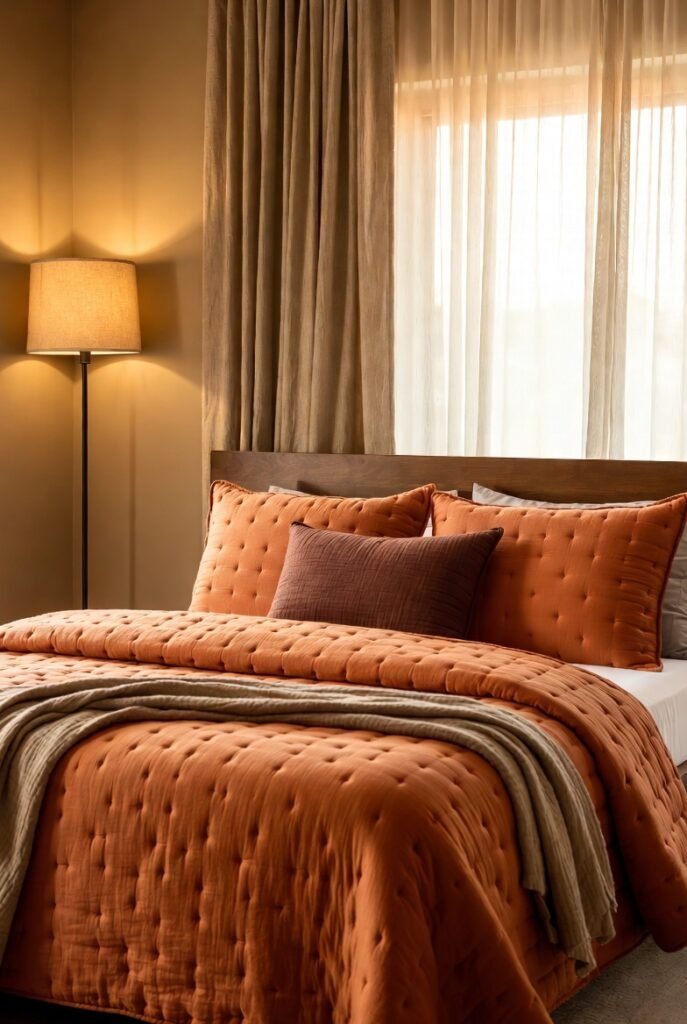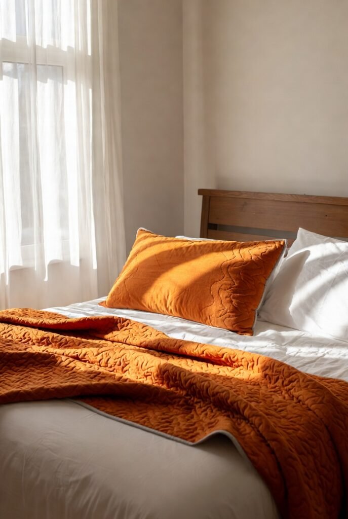 I use umber throw pillows, blankets, or even a duvet to add a touch of understated elegance. It’s a sophisticated way to incorporate orange without the brightness of more citrusy tones.