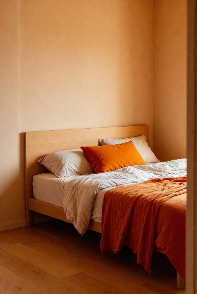 I use orange bedding or an accent wall alongside hardwood floors, a wooden bed frame, or a vintage dresser. The combination of natural wood and warm orange creates a welcoming atmosphere.