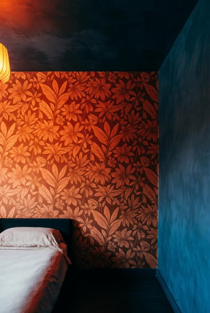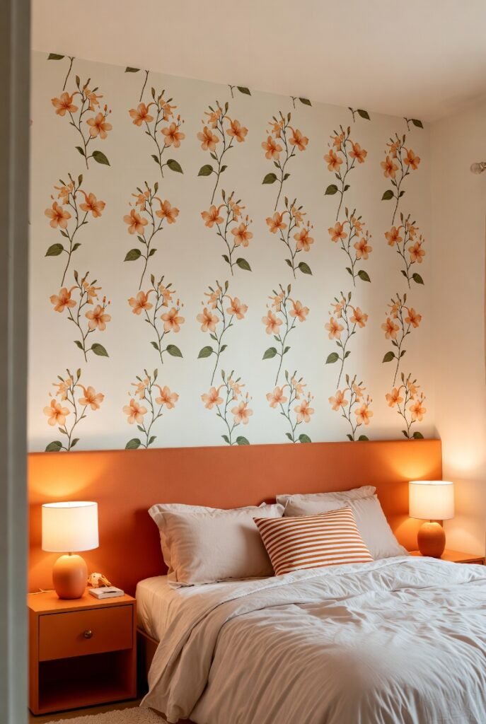 Wallpaper is one of my favorite tools for transforming a room, and an orange floral print is a beautiful choice. I look for designs with delicate orange flowers to give the room a fresh, botanical feel.