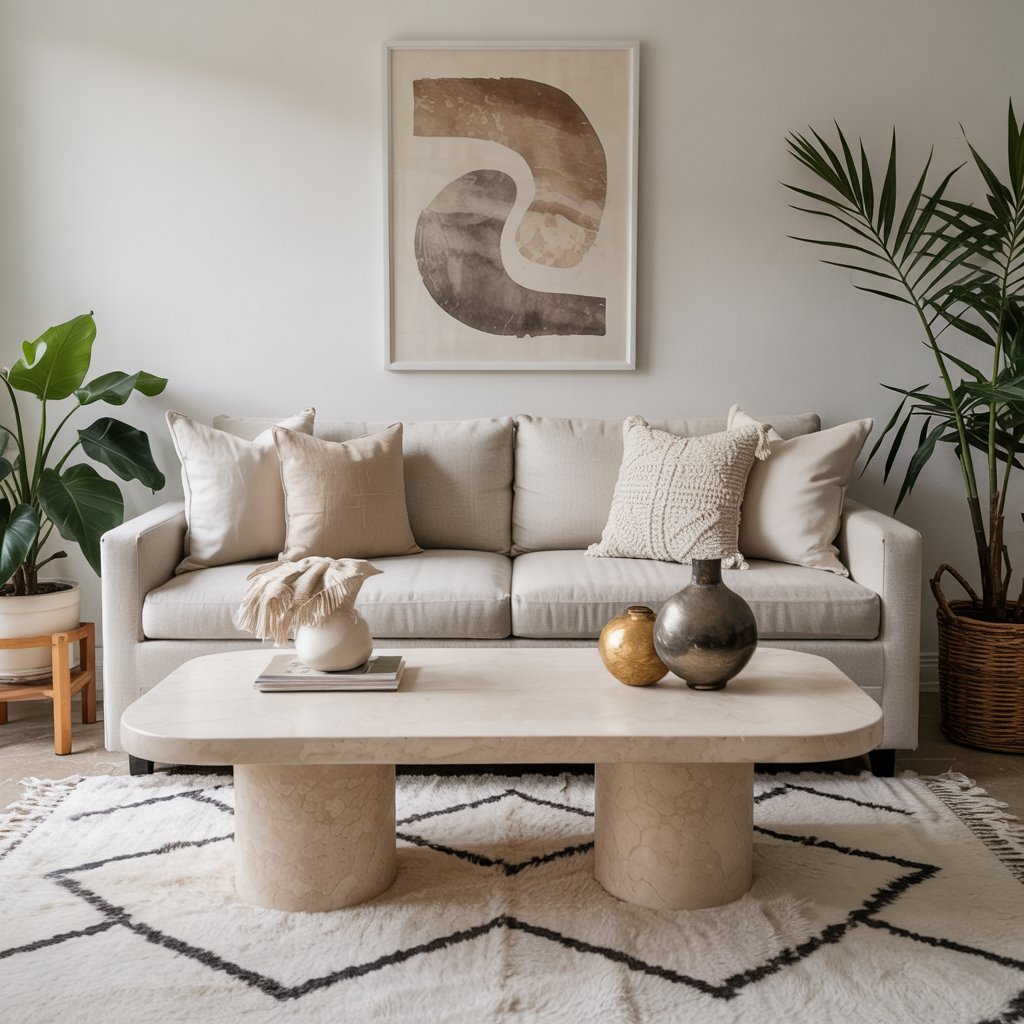 I liven up minimalist spaces with just a touch of pattern through abstract cream area rugs and boho throw pillows. I select coffee tables with large, pillar-style legs for sculptural interest.