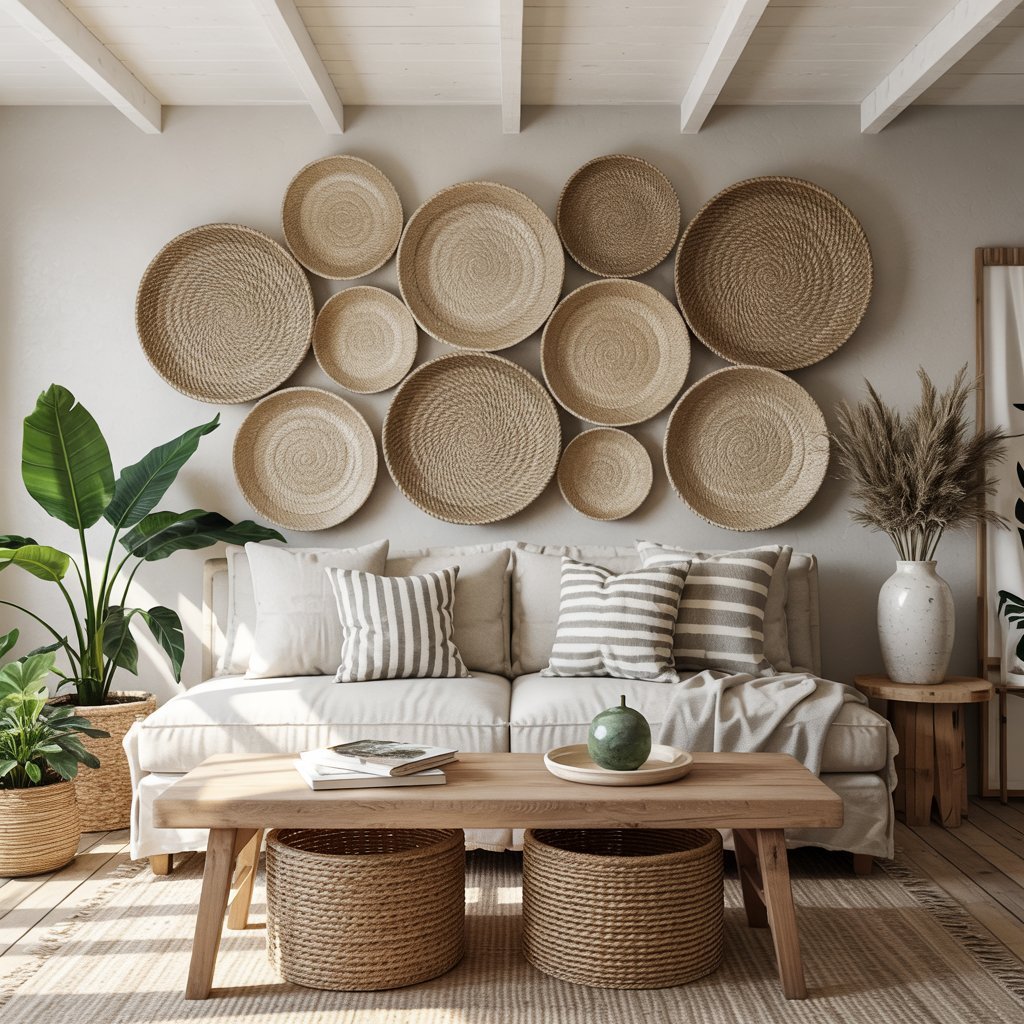 I prove that bright colors aren’t necessary to create dynamic spaces by using natural elements as art. I arrange mounted sisal baskets on an accent wall for an artistic, curated feeling.