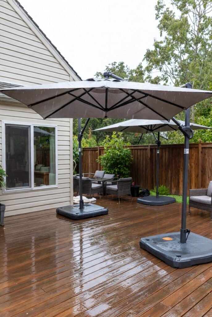 A high-quality cantilever umbrella can be a surprisingly effective rain cover for smaller areas. The offset base means the pole is out of the way, leaving more usable space underneath.