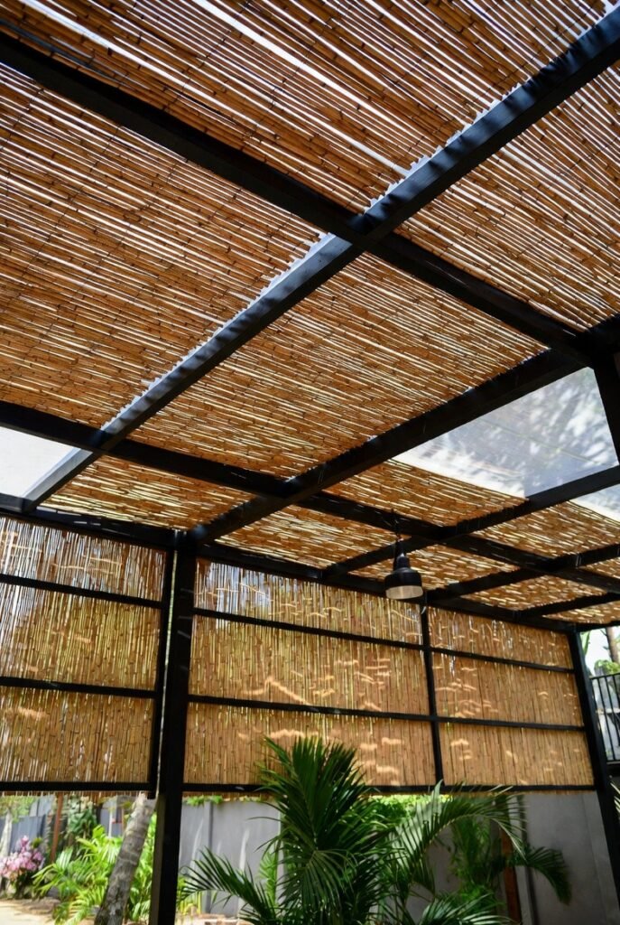 I love the natural, tropical vibe of bamboo or reed roofing. On its own, it only provides light shade, but I can make it waterproof by adding a clear polycarbonate layer underneath.