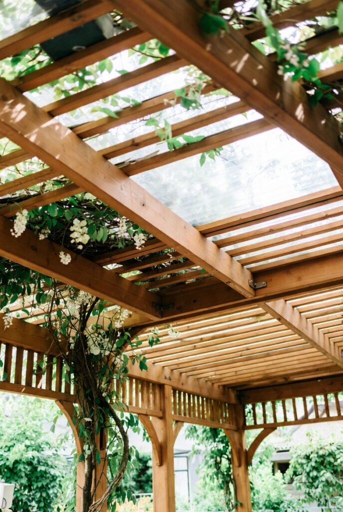 To make it waterproof, I can add a clear polycarbonate roofing panel on top of the slats. This preserves the open, airy feel while keeping the area below dry. I also love growing climbing vines like wisteria or jasmine over the structure for a touch of natural beauty.